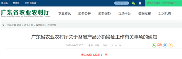 为贯彻落实《广东省人民政府关于加强生猪和生猪产品质量安全全程监管推进屠宰产业高质量发展的意见》(粤府〔2020〕24号)(下简称“省政府《意见》”)和省政府“放管服”改革精神,优化营商环境,激发市场活力,确保畜禽产品市场流通顺畅,现就畜禽产品分销换证工作有关事项通知如下: