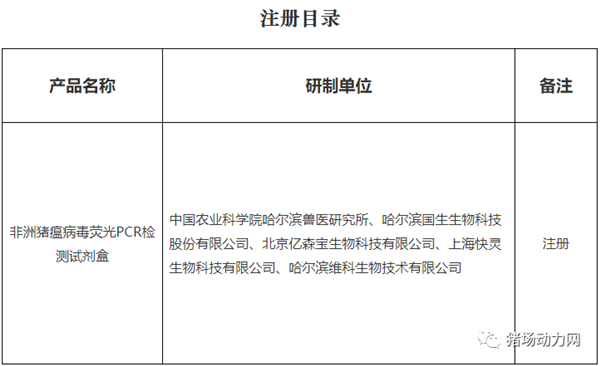 4月14日,农业农村部发布公告,批准中国农业科学院哈尔滨兽医研究所等5家单位申报的非洲猪瘟病毒荧光PCR检测试剂盒产品注册。