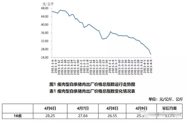 据农业农村部信息中心和山东卓创资讯股份有限公司联合监测,2021年第14周(即2021年4月6日-4月9日),16省(直辖市)瘦肉型白条猪肉出厂价格总指数的周平均值为每公斤27.05元,环比下跌13.1%,同比下跌37.8%,较上周扩大6.9个百分点。