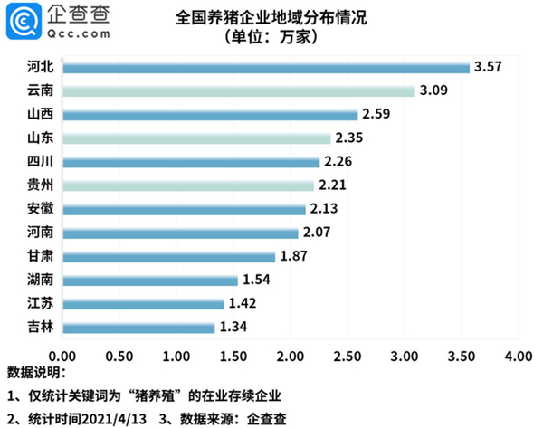 据企查查数据显示,我国目前共有37.65万家养猪相关企业,今年一季度新增注册企业1.36万家,同比增长19%。