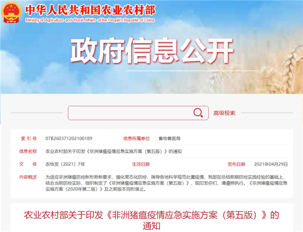 农业农村部印发《非洲猪瘟疫情应急实施方案(第五版)》