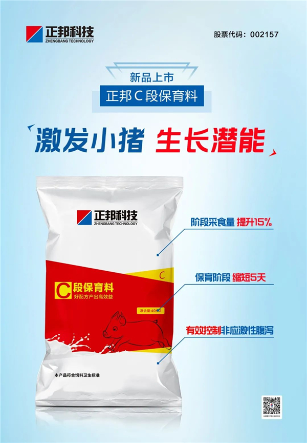 正邦集团还在此次畜博会上发布了全新一代保育料——正邦C段高能保育料产品,与去年推出的AB包敎槽料产品形成套餐系列。在无抗大背景下,正邦C段高能保育料的推出解决了保育阶段低蛋白配方导致的长速慢问题,为养殖行业在无抗时代的高效保育提供了新的方向。