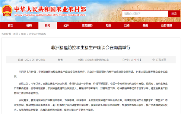 农业农村部:非瘟防控与生猪生产座谈会在南昌举行