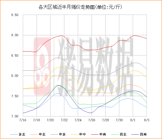 各大区域猪价表现:东北、华北、华东、华中、西南、西北华南地区猪价呈现微幅下跌态势,生猪平均价格跌幅有所扩大。