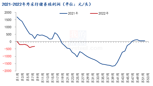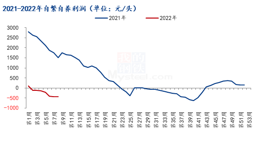 从上图看出,无论是自繁自养还是仔猪育肥,进入2022年之后养殖盈利多数处于亏损阶段,自繁自养亏损值高于外购仔猪,全国亏损值在450-500元/头之间,原料成本持续增加,豆粕因供应偏紧,价格持续上涨;但猪价继续下滑,均价已经跌破六元关口,养殖场亏损持续拉大。