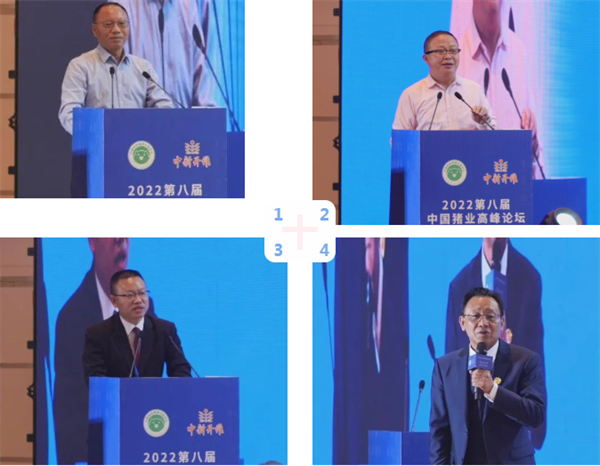 ▲图为:开幕式嘉宾致辞(左上1:专家代表西南农大教授、科信药业董事长张洪培先生,右上2:企业代表扬翔集团副总裁高远飞先生,左下3:协办方代表湖北中新开维总经理金林先生致辞,右下4:主办方代表中国猪业高层交流论坛会长李俊柱先生)