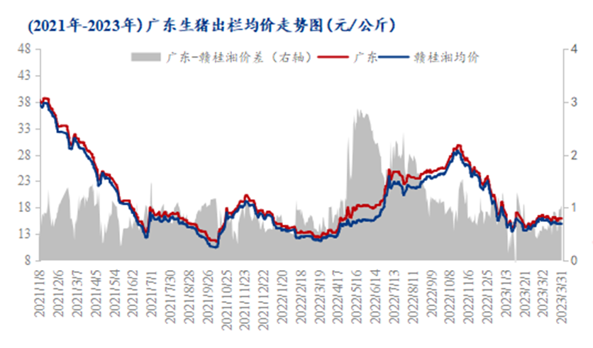 如图所示2022年4-10月广东价格高于赣桂湘三省的价差较大,2023年春节过后,两者价差微小,因此三省的生猪调运广东受阻,当前多以调运山东、江苏和浙江为主。广东猪价没有明显优势后,南方猪价话语权持续偏弱,年后业内人士纷纷去广东调研市场,不少人感慨经济大不如前,肉价上涨乏力,大有经济萧条之像,广东的经济现状也成了热议话题,逆全球化和全球贸易摩擦导致全球经济和贸易活动低迷,势必影响外向型经济特征明显的广东财政收入。