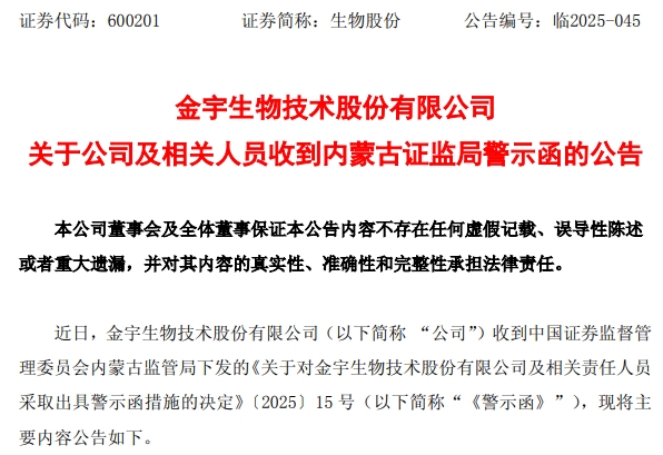 7月24日,生物股份(600201)发布公告,近日,公司收到内蒙古证监局下发的《关于对金宇生物技术股份有限公司及相关责任人员采取出具警示函措施的决定》。