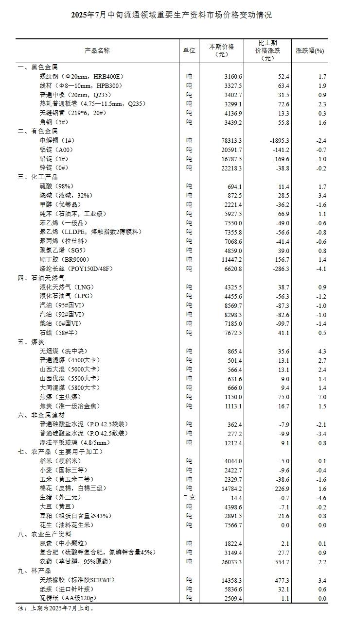 据对全国流通领域9大类50种重要生产资料市场价格的监测显示,2025年7月中旬与7月上旬相比,28种产品价格上涨,20种下降,2种持平。