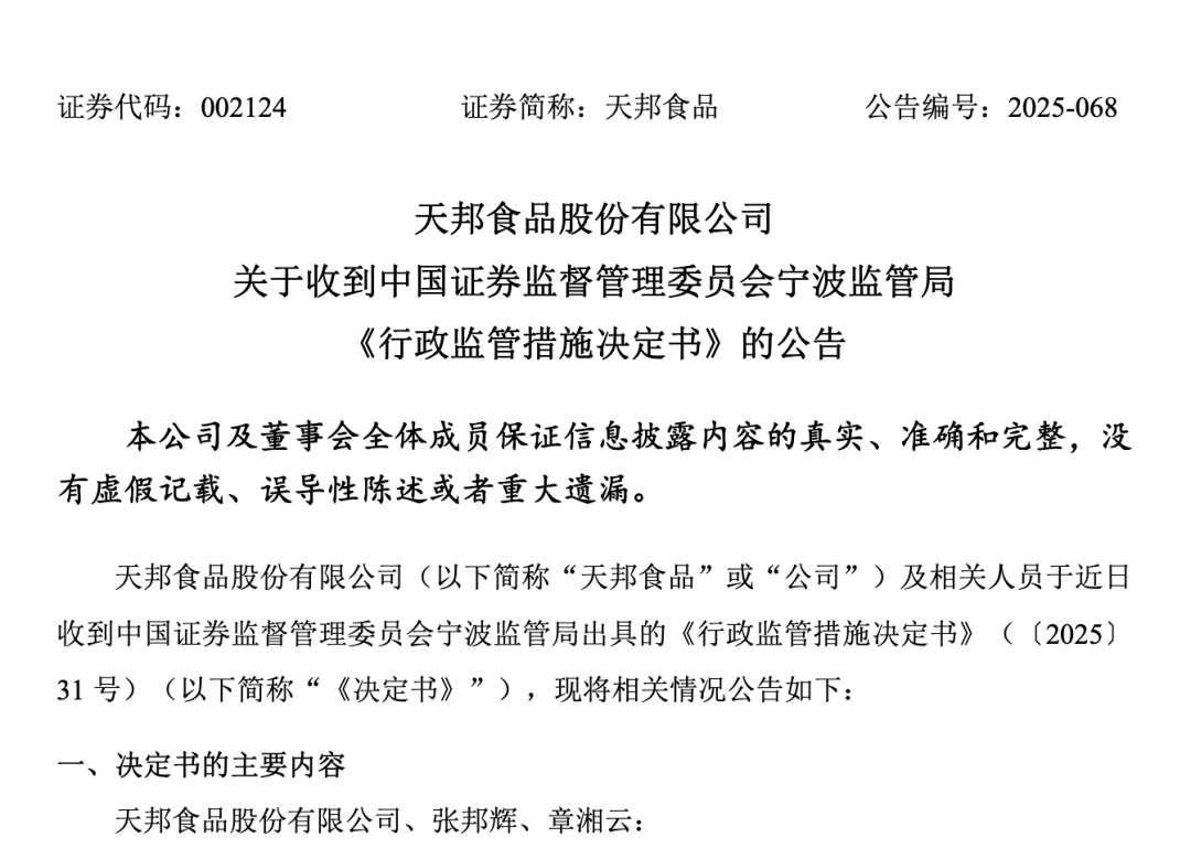 9月29日,天邦食品(002124.SZ)发布公告称,公司及相关人员于近日收到中国证券监督管理委员会宁波监管局出具的《行政监管措施决定书》(下称《决定书》)。