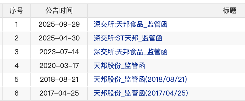 更早之前的2017年、2018年,天邦食品也曾收到监管函。尽管公司每次均表态“杜绝此类事件再次发生”,但违规问题仍反复出现。