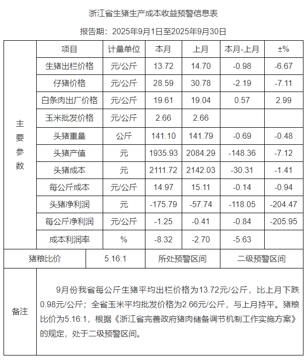 浙江省定点养猪场(户)月报调查数据显示,2025年9月份浙江省生猪出栏价格出现大幅下跌,养殖亏损面继续扩大。
