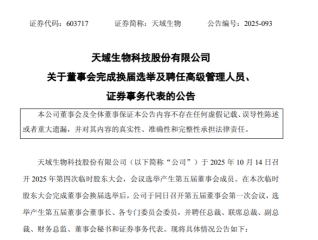10月14日,天域生物发布公告,宣布完成董事会换届选举。根据公告内容,实控人罗卫国连任董事长,副董事长史东伟离场,董事会由7名董事组成,核心高管大换血。这场人事地震,究竟是应对行业寒冬的被动收缩,还是战略突围的主动求变?
