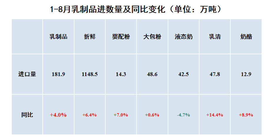 1—8月,进口各类乳制品181.9万吨,同比增4.0%,折合生鲜乳1148.5万吨,同比增6.4%(干制品按1:8,液态奶按1:1折算);进口额85.9亿美元,同比增16.4%。
