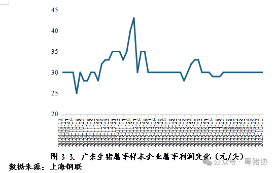 从样本企业屠宰利润看(图3-3),9月至10月上旬,广东生猪屠宰样本企业屠宰利润整体保持稳定在30元/头。由于屠宰企业在采购量、成本控制等方面的策略已较为成熟,能够较好地平衡生猪采购价与白条肉售价,使得利润维持在相对稳定的水平,因此价格波动不明显,体现出屠宰企业在市场运营中进一步适应了市场环境,抗风险水平有所提升,利润稳定性增强。