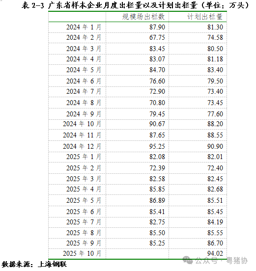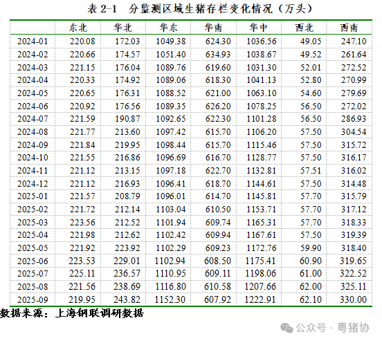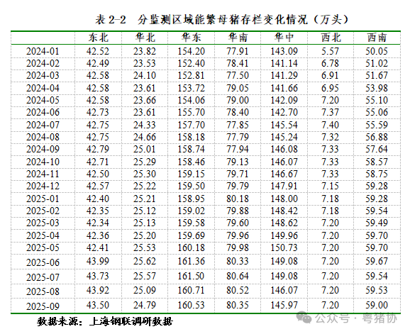 由于广东省农业农村厅没有正式公布9月份生猪生产数据,所以生猪生产相关数据我们选用第三方调研数据,华南地区(含广东)9月存栏量为607.92万头,较8月环比下降0.44%,相比前2个月有明显下跌态势。与2024年同期相比,9月较2024年9月的615.7万头下降1.26%,整体存栏量仍低于去年同期。