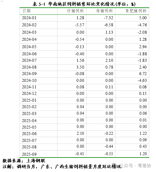 2025年7、8月,仔猪饲料销售环比维持0.00%,反映出养殖户补栏情绪又趋于谨慎,结合当时仔猪价格等因素,养殖利润预期未出现明显改善,补栏需求保持稳定。9月仔猪饲料销售环比下降0.41%,是今年首度出现下跌,受市场猪价低迷、养殖利润缩减影响,补栏需求疲弱,进而影响仔猪饲料购买需求。