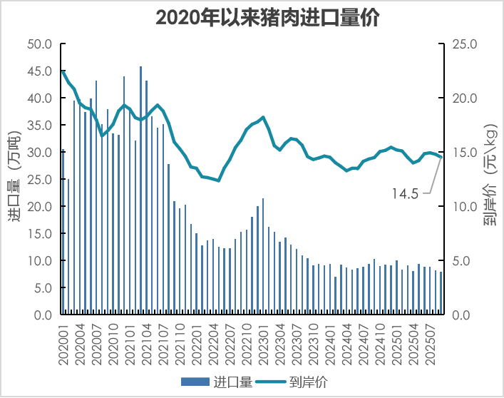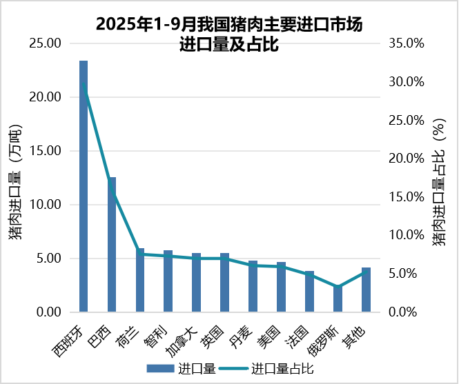 1.猪肉进口减少。1—9月,猪肉及杂碎进口169.7万吨,同比降1.0%;进口额35.5亿美元,同比降0.1%。其中,猪肉进口78.8万吨,同比降1.3%,进口额16.0亿美元,同比增2.3%。主要来自西班牙、巴西、荷兰、智利和加拿大等国,分别占进口总量的29.8%、16.0%、7.5%、7.3%和7.0%,合计占比67.6%。其中,从巴西和智利进口分别同比降33.0%、3.9%,从西班牙、荷兰和加拿大进口分别同比增7.8%、2.7%、和4.5%。