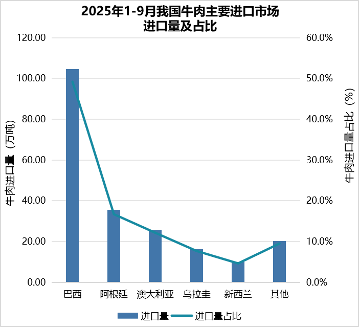 3.牛肉进口增加。1—9月,牛肉进口212.5万吨,同比降增1.0%;进口额111.0亿美元,同比增10.7%。进口主要来自巴西、阿根廷、澳大利亚、乌拉圭和新西兰等国,分别占进口总量的49.2%、16.7%、12.2%、7.7%和4.7%,合计占90.5%。其中,从巴西和澳大利亚进口分别同比增13.2%和47.5%,从阿根廷、乌拉圭和新西兰进口分别同比降18.6%、15.0%和21.9%。