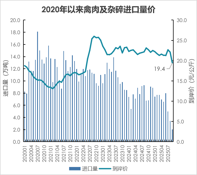 2.禽肉产品进口减少、出口增加。1—9月,禽肉及杂碎进口54.9万吨,同比降21.6%;进口额16.5亿美元,同比降24.4%。其中,禽肉进口24.4万吨,同比降18.8%;进口额6.6亿美元,同比降22.8%。主要来自巴西、俄罗斯、泰国、白俄罗斯和美国等国,分别占进口总量的64.8%、15.2%、11.8%、1.4%和1.0%,合计占比97.8%。其中,从巴西、白俄罗斯和美国进口分别同比降26.5%、46.8%和71.0%,从俄罗斯和泰国进口分别同比增21.0%和1.3%。1—9月禽肉及杂碎出口53.9万吨,同比增53.9%;出口额9.2亿美元,同比增25.6%;加工禽肉出口34.2万吨,同比增13.5%;出口额12.6亿美元,同比增9.5%。
