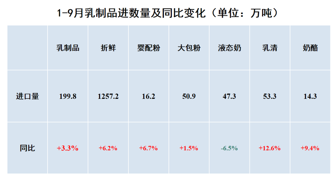 1—9月,进口各类乳制品199.8万吨,同比增3.3%,折合生鲜乳1257.2万吨,同比增6.2%(干制品按1:8,液态奶按1:1折算);进口额95.5亿美元,同比增15.8%。