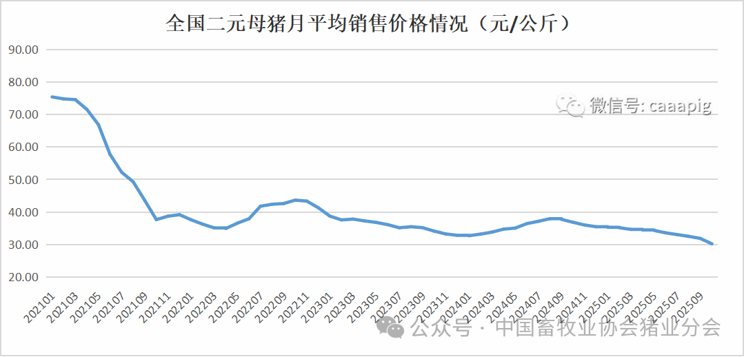 1、2025年10月份全国二元母猪销售价格30.21元/公斤,环比下跌5.2%,同比下跌18.0%。