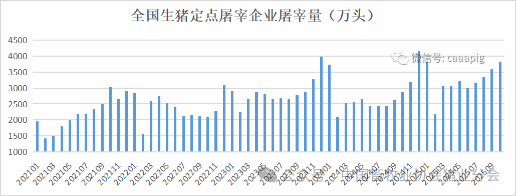 2、2025年10月份生猪定点屠宰企业屠宰量3834万头,环比增长7.0%,同比增长26.2%。