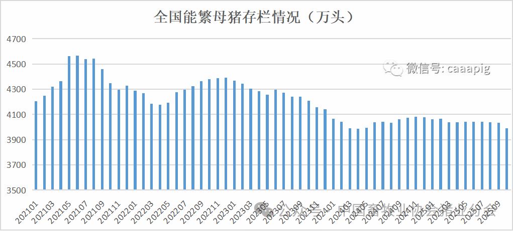 1、2025年10月末能繁母猪存栏3990万头,环比下降1.1%,同比下降2.1%,相当于正常保有量的102.3%,产能正常,处于绿色区域。