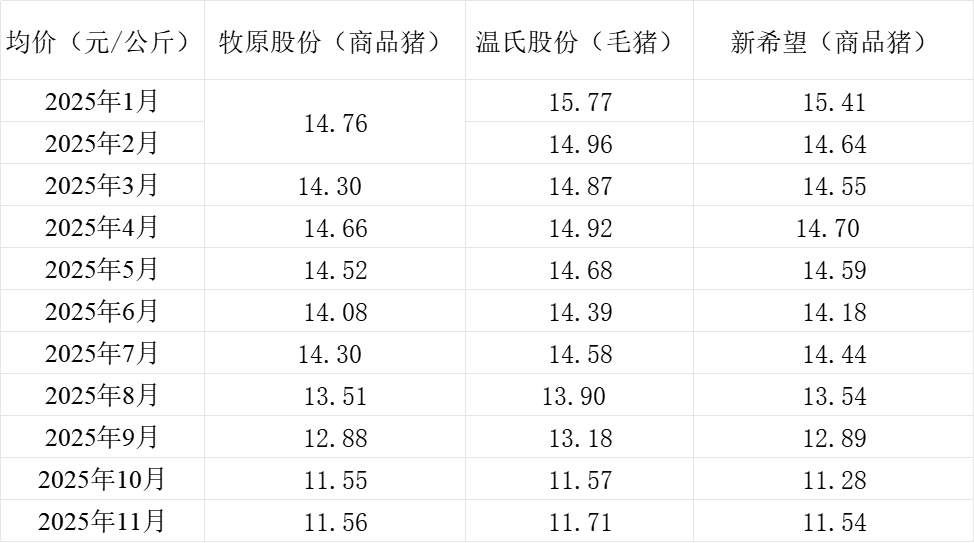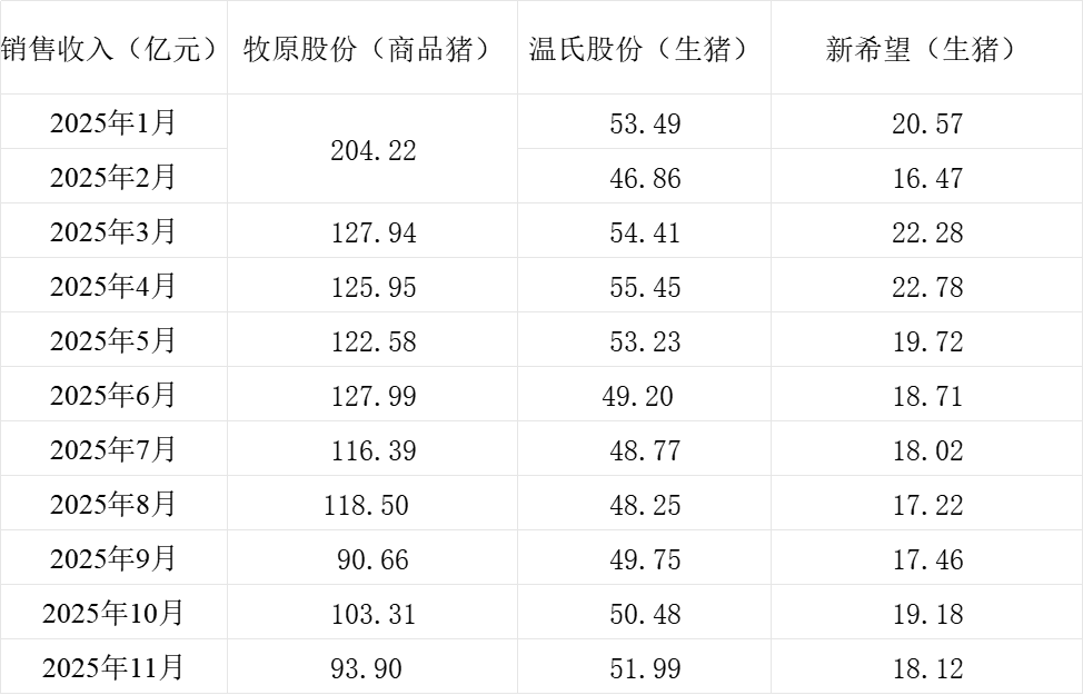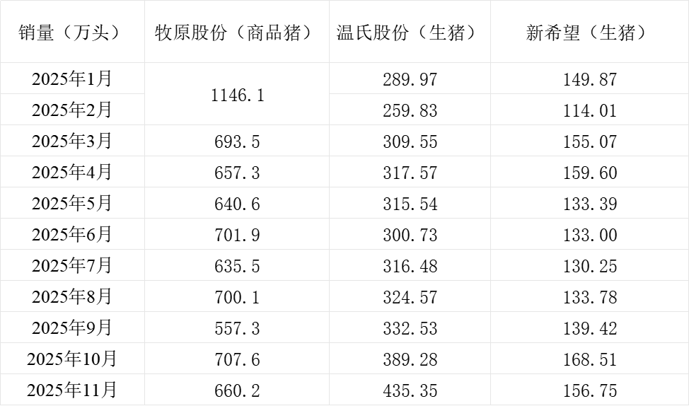三大上市猪企牧原股份(002714.SZ)、新希望(000876.SZ)、温氏股份(300498.SZ)近日发布2025年11月生猪销售情况。