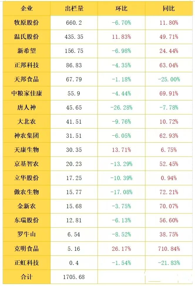 同比表现与环比相反,15家企业实现正增长,彰显行业整体扩张势头。其中克明食品(+710.84%)、傲农生物(+72.21%)、金新农(+70.07%)增幅居前,正邦科技、神农集团、东瑞股份、京基智农同比增速均超50%。天邦食品、唐人神和正虹科技同比下滑,推测与前期产能收缩或市场策略调整相关。