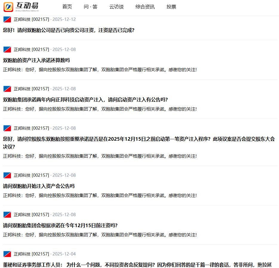 投资者对“双胞胎”履行承诺一事也十分关心,多次在投资者互动平台问及进展,甚至一天的四条问题都与此有关。正邦科技则表示,经向控股股东“双胞胎”了解,“双胞胎”会严格履行相关承诺。