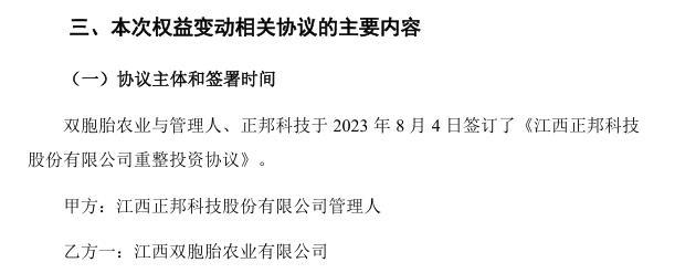 2023年12月15日,正邦科技收到江西省南昌市中级人民法院送达的《民事裁定书》,裁定确认正邦科技重整计划执行完毕并终结上市公司重整程序。之后的12月27日,正邦科技控股股东变更为“双胞胎”,公司实控人变更为鲍洪星、华涛、鲍华悦。