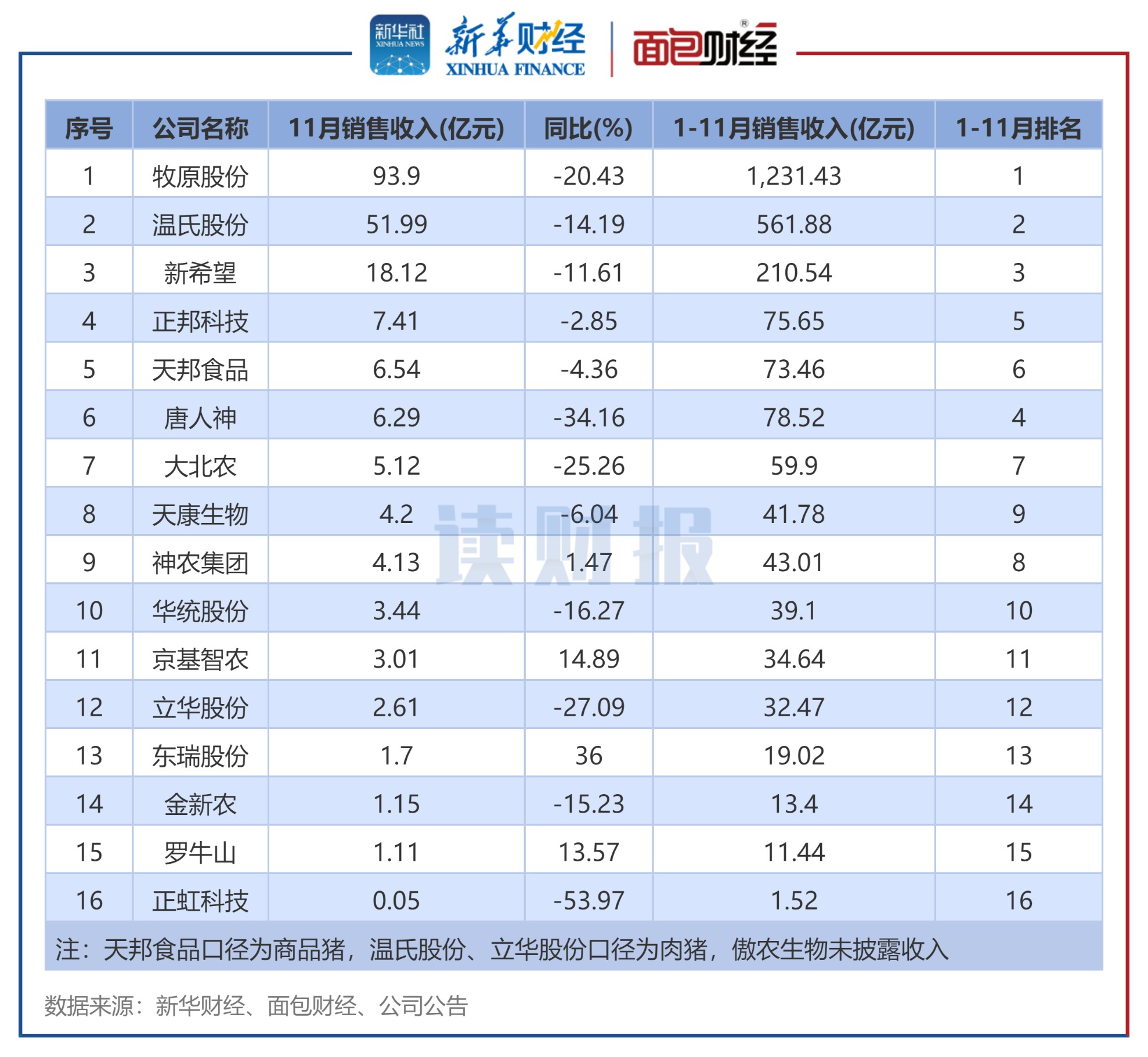 近期,生猪养殖企11月的销售数据陆续披露。新华财经和面包财经研究员在剔除部分数据披露不全的上市猪企后,以沪、深两大交易所主要上市生猪养殖企业为样本,分别统计其生猪销售收入、销量。