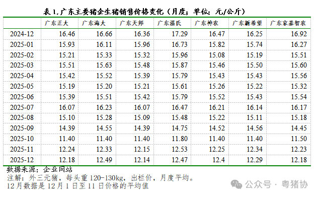 广东省主要养殖企业的商品猪销售均价从2024年12月的16-17元/公斤高位区间,一路震荡下行。至2025年10月,价格已跌至11.4-11.8元/公斤的谷底。尽管进入12月传统消费旺季,价格出现微弱反弹,但主要企业均价仅在12.1-12.5元/公斤区间徘徊(详见表1),与去年同期相比,回落幅度高达25%-30%,反弹力度远不及市场预期,“旺季不旺”特征极为明显。