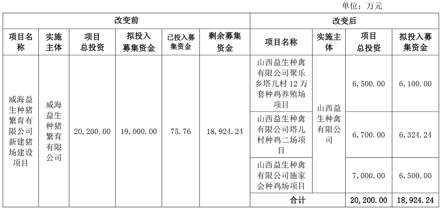 终止原项目后,闲置募集资金将投向山西益生种禽有限公司旗下三个项目,分别为聚乐乡塔儿村12万套种鸡养殖场、塔儿村种鸡二场及施家会种鸡场,三个项目均为公司在山西大同云州区规划的“100万套父母代种鸡养殖场及配套项目”的组成部分。