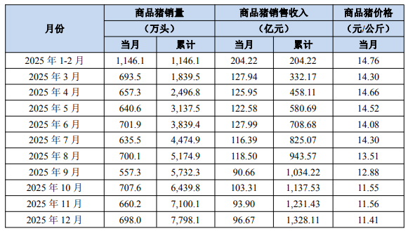 牧原股份(603688)发布公告称,公司2025年12月销售商品猪698.0万头,同比变动-14.75%;商品猪销售均价11.41元/公斤,同比变动-25.38%,下行趋势明显;商品猪销售收入96.67亿元,同比变动-36.06%。