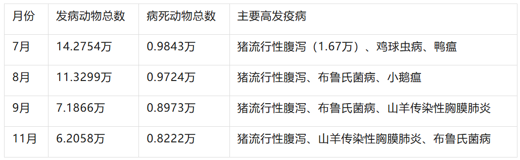 夏季高发期(7-8月):全国发病动物总数达14.28万头/羽/只/匹(7月)和11.33万头/羽/只/匹(8月),以猪流行性腹泻、鸭瘟、鸡球虫病等为主要病种。