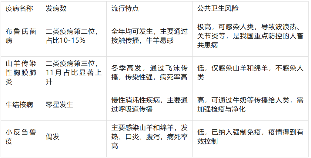 核心特点:牛羊疫病以人畜共患病和呼吸道疾病为主,布鲁氏菌病防控形势严峻,需要兼顾动物健康与公共卫生安全河北省农业农村厅。