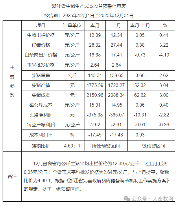 2025年12月份,浙江省生猪平均出栏价格为12.39元/公斤,比上月略涨0.05元/公斤,涨幅为0.41%。