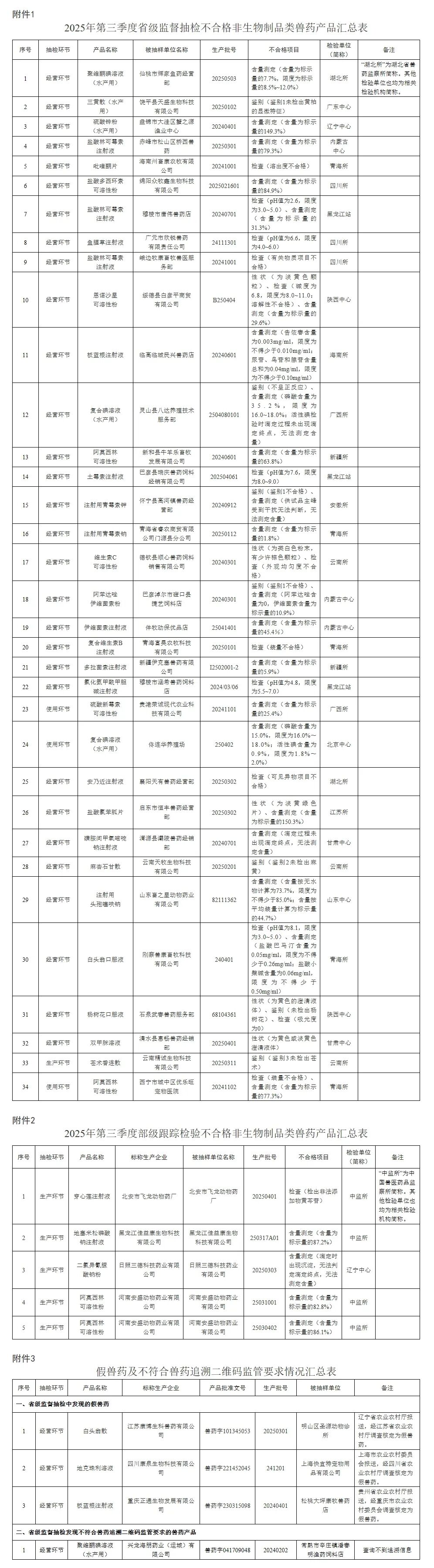 1.2025年第三季度省级监督抽检不合格非生物制品类兽药产品汇总表