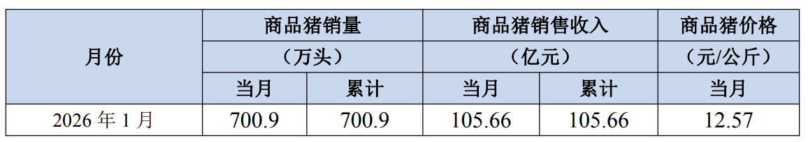 公告显示,2026年1月份,公司销售商品猪700.9万头,同比变动2.73%(其中向全资子公司牧原肉食品有限公司及其子公司合计销售商品猪311.6万头);商品猪销售均价12.57元/公斤,同比变动-16.92%。商品猪销售收入105.66亿元,同比变动-11.93%。