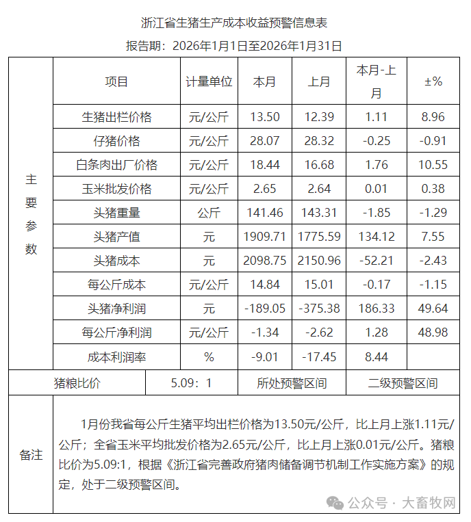 2026年1月份,浙江省生猪平均出栏价格为13.50元/公斤,比上月上涨1.11元/公斤,涨幅为8.96%,为近5个月最高价。