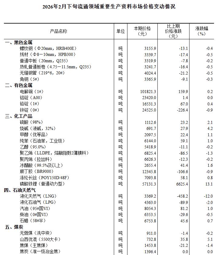 3月4日,国家统计局发布2026年2月下旬流通领域重要生产资料市场价格变动情况。