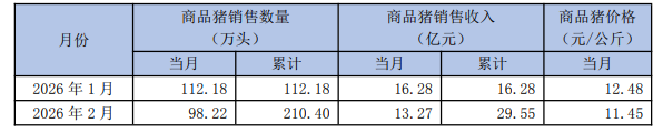 2026年1-2月,公司累计销售商品猪210.40万头,累计销售收入29.55亿元。
