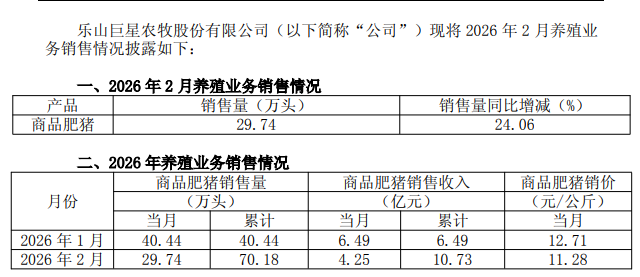3月9日,巨星农牧(603477.SH)披露2026年2月养殖业务销售情况。公司2月商品肥猪销售量29.74万头,同比增长24.06%;商品肥猪销售收入4.25亿元,商品肥猪销价11.28元/公斤。