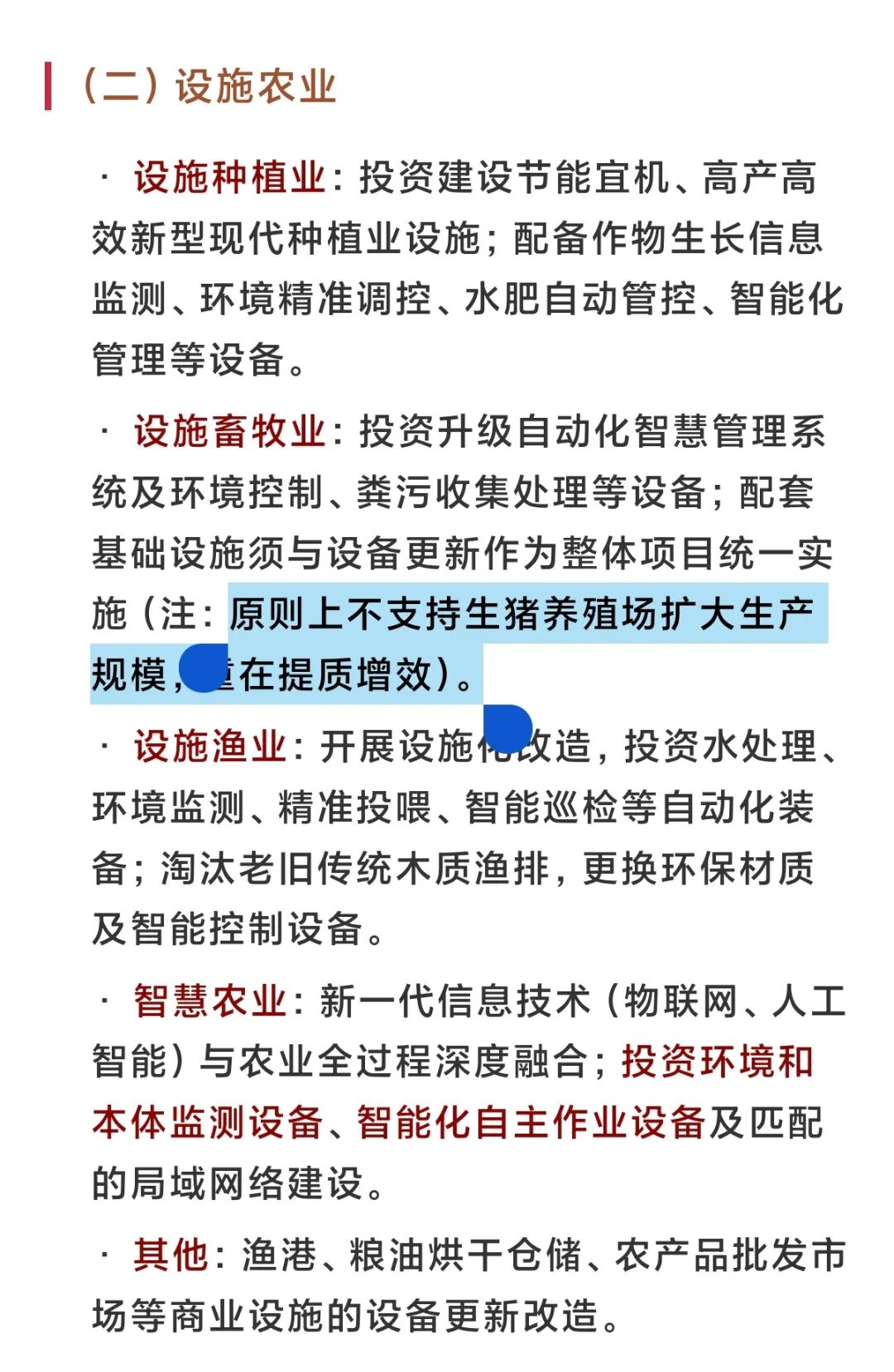 3月9日,农业农村部计划财务司印发《农业农村部计划财务司关于落实涉农领域设备更新贷款相关政策的通知》。划重点:原则上不支持生猪养殖场扩大生产,重在提质增效。政策导向转向提质增效、设备更新与绿色改造。