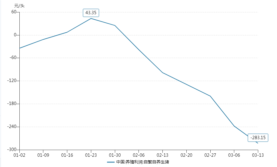 博亚和讯追踪的周度养殖利润(自繁自养)数据也显示,今年2月6日当周生猪养殖利润重新转为亏损38元/头,并在此后持续扩大至3月13日当周的283元/吨。