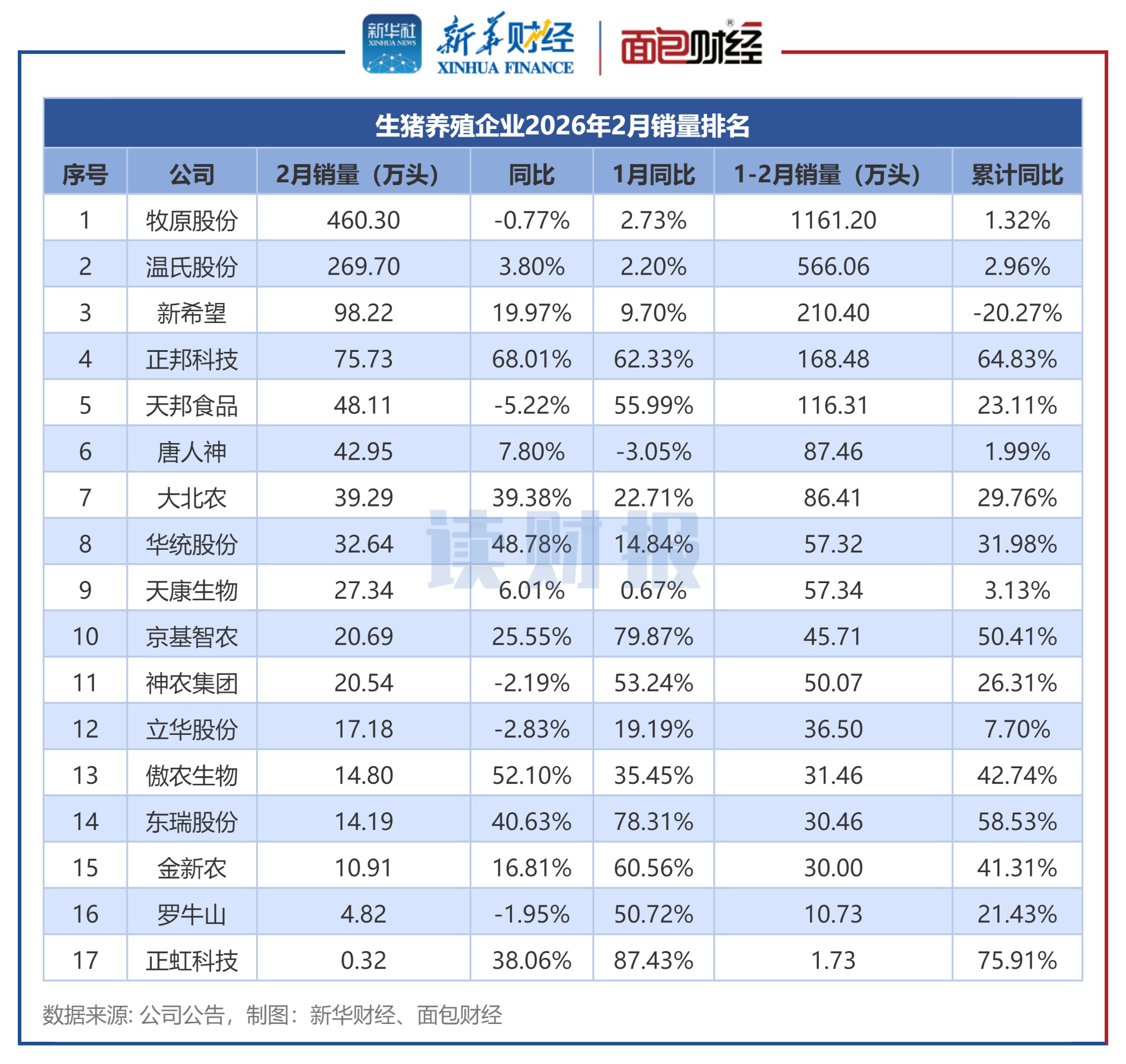 2026年2月,包括傲农生物在内的17家上市生猪养殖企业合计销量达1197.73万头。其中,牧原股份销量达460.3万头,温氏股份、新希望的销量分别为269.7万头、98.22万头。当月多数企业的销量实现同比增长,其中正邦科技、傲农生物的增速超过50%。相比之下,天邦食品、立华股份等5家公司出现销量同比下滑。