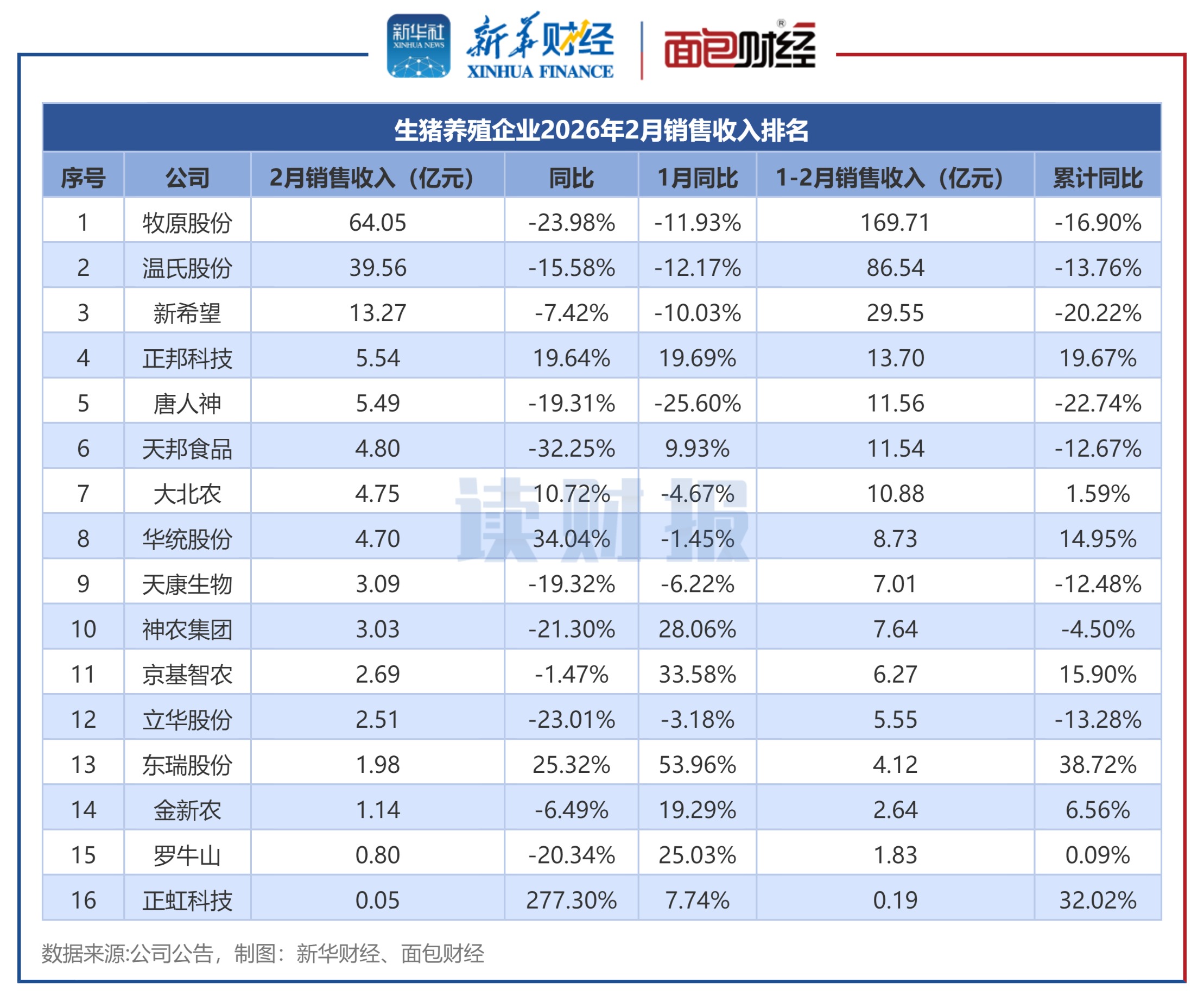 2026年2月,16家上市生猪养殖企业合计销售收入达157.46亿元(傲农生物未披露收入数据)。其中,牧原股份、温氏股份、新希望位列2月销售收入前三位,均超过10亿元。同比来看,2月正虹科技、华统股份、东瑞股份的销售收入增速相对居前,天邦食品、牧原股份等8家公司的2月销售收入同比降超10%。