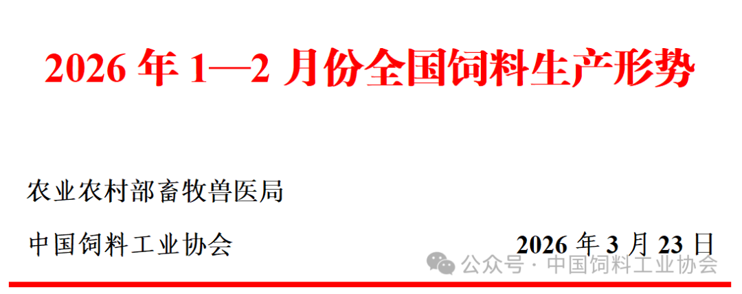 2026年1—2月,全国工业饲料产量5185万吨,同比增长3.4%。其中,配合饲料、添加剂预混合饲料同比分别增长4.0%、3.8%,浓缩饲料同比减少10.6%。主要饲料产品出厂价格同比涨跌互现,与上年12月份相比,畜禽配合饲料、浓缩饲料、添加剂预混合饲料出厂价格以降为主。饲料企业生产的配合饲料中玉米用量占比为46.9%,比上年12月份增长1.0个百分点;配合饲料和浓缩饲料中豆粕用量占比为13.0%,比上年12月份减少0.7个百分点。
